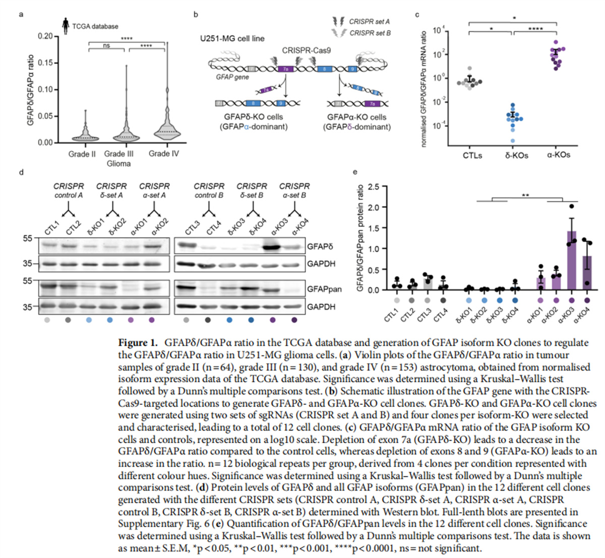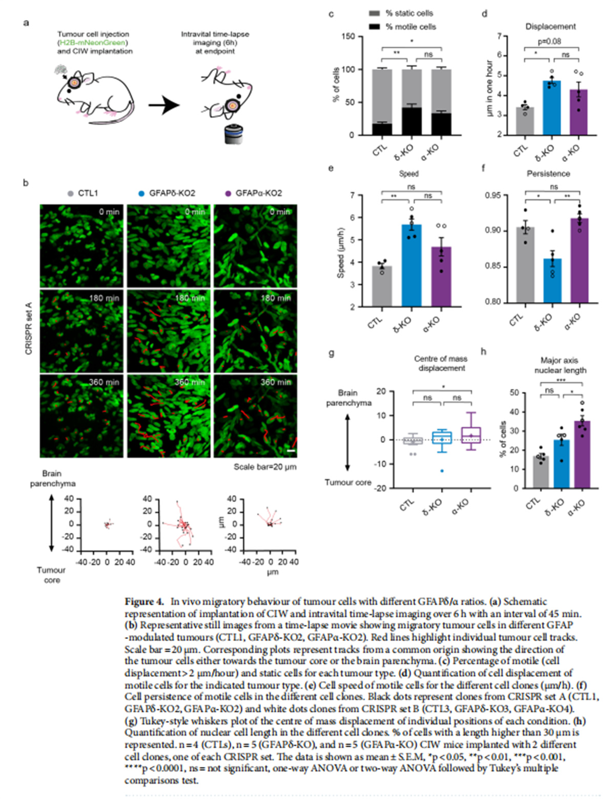 低級(jí)別和高級(jí)別膠質(zhì)瘤之間的GFAP異構(gòu)體表達(dá)不同(見圖一);使用CRISPR-Cas9修飾GFAPisoform表達(dá)(見圖一);GFAP亞型的消耗增加了離體器官型腦切片中的細(xì)胞侵襲(見圖二);GFAPα同種型的消耗導(dǎo)致體內(nèi)更多的彌漫性腫瘤(見圖三);GFAP同種型的消耗增加了運(yùn)動(dòng)性并改變了體內(nèi)的入侵模式(見圖四);