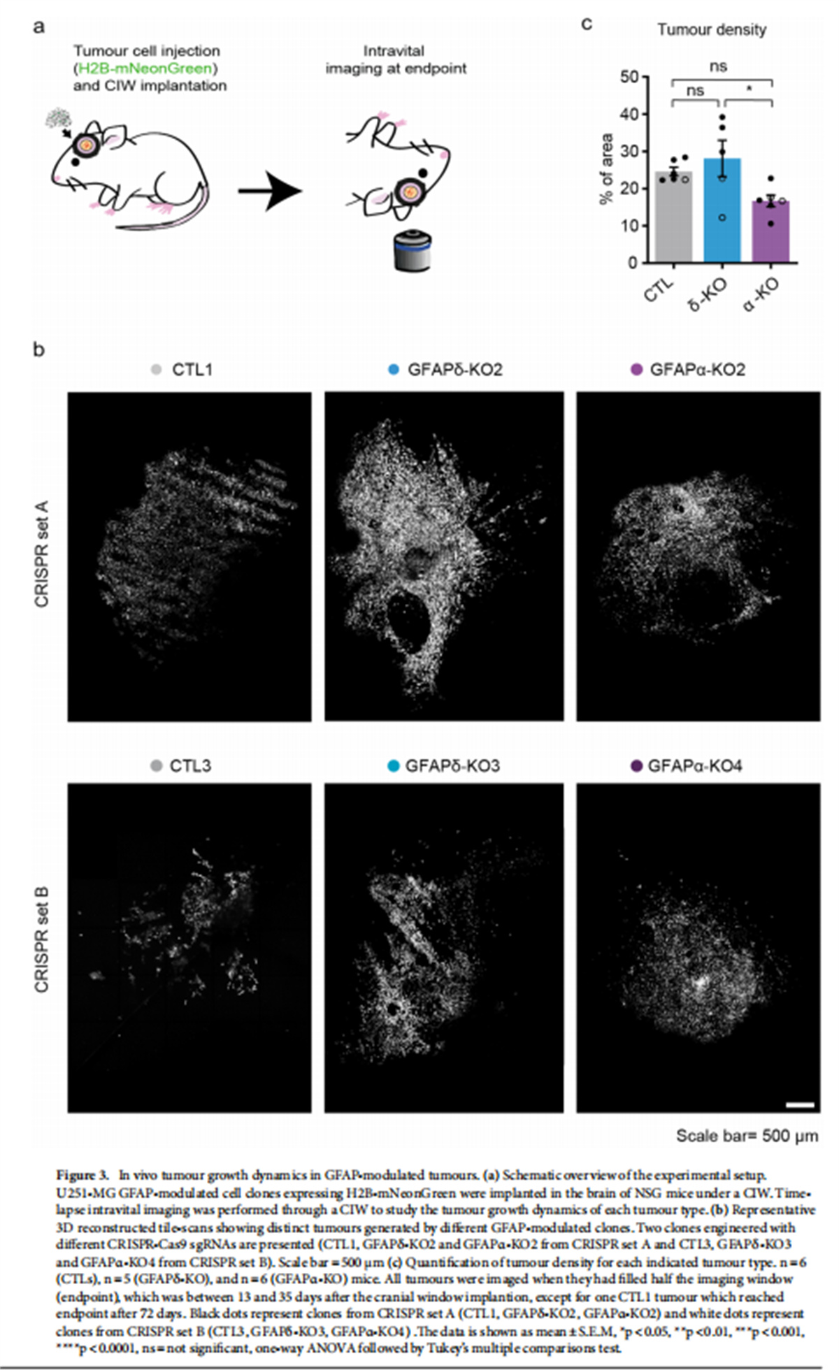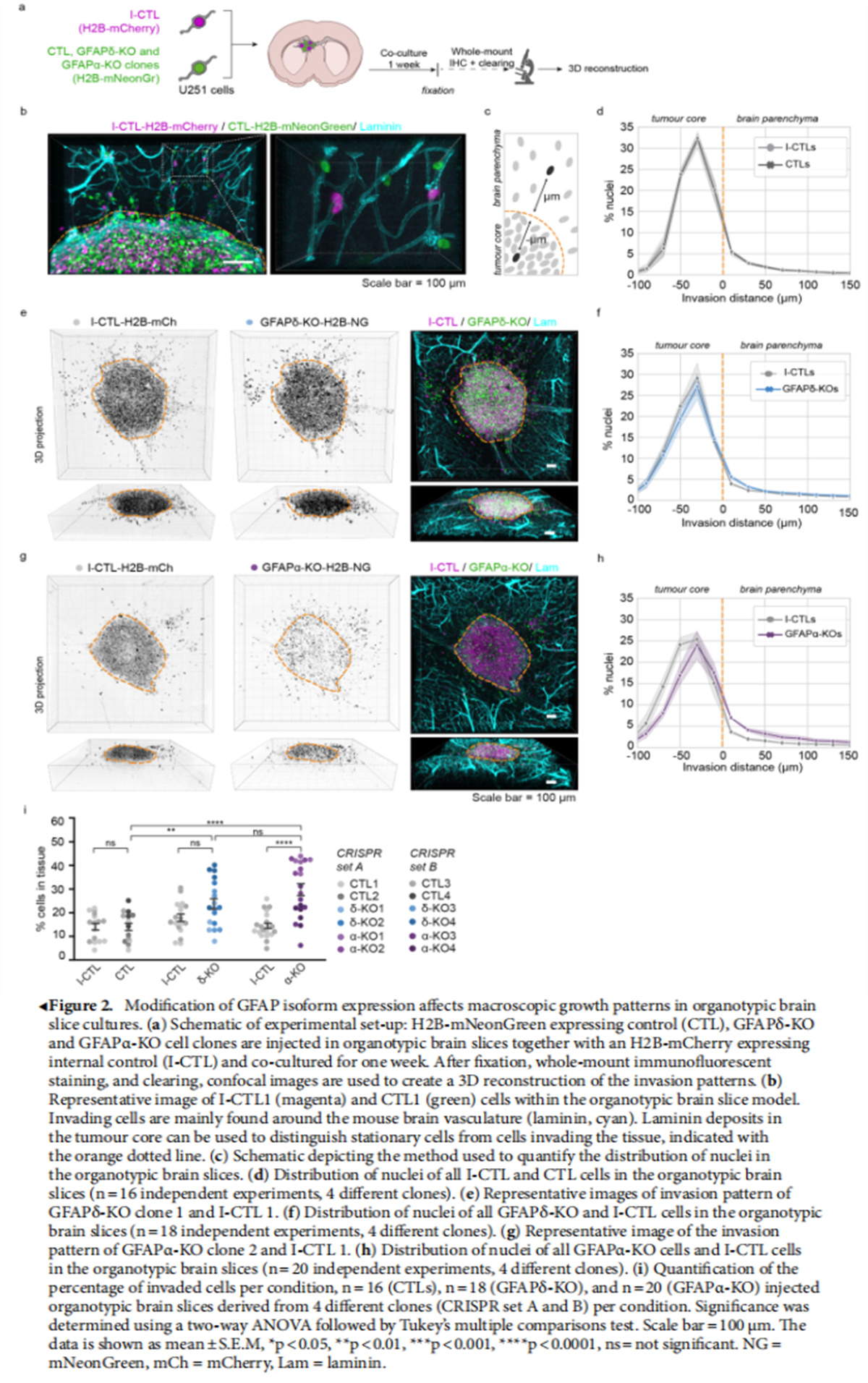 在這項(xiàng)研究中,作者研究了GFAP異構(gòu)體表達(dá)的操縱如何影響人膠質(zhì)瘤細(xì)胞的侵襲和生長(zhǎng)動(dòng)力學(xué)離體和體內(nèi)。我們通過(guò)活體成像縱向監(jiān)測(cè)了總共12個(gè)U251-MG膠質(zhì)瘤細(xì)胞克隆的生長(zhǎng)模式,這些細(xì)胞在離體器官型小鼠腦切片和體內(nèi)小鼠大腦中從GFAPαGFAPδ同種型中耗盡。作者表明,GFAP網(wǎng)絡(luò)的操作強(qiáng)烈影響神經(jīng)膠質(zhì)瘤細(xì)胞的運(yùn)動(dòng)性和腫瘤生長(zhǎng)模式。GFAPδ-KO細(xì)胞形成更致密的腫瘤,與對(duì)照腫瘤相比具有增加的運(yùn)動(dòng)性并且隨機(jī)遷移,而GFAPα-KO細(xì)胞顯示出更分散的生長(zhǎng)模式并且更持久地向腦實(shí)質(zhì)遷移。